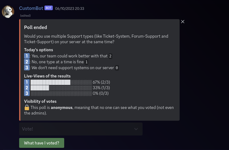 EmojisIn diesen Feldern kannst du die Emojis anpassen, die neben jeder Abstimmungsoption im Dropdown-Menü und im Embed angezeigt werden. Stelle sicher, dass du Unicode-Werte für integrierte Emojis oder gültige Emoji-IDs (nicht nur den Namen) für benutzerdefinierte Emojis eingibst.