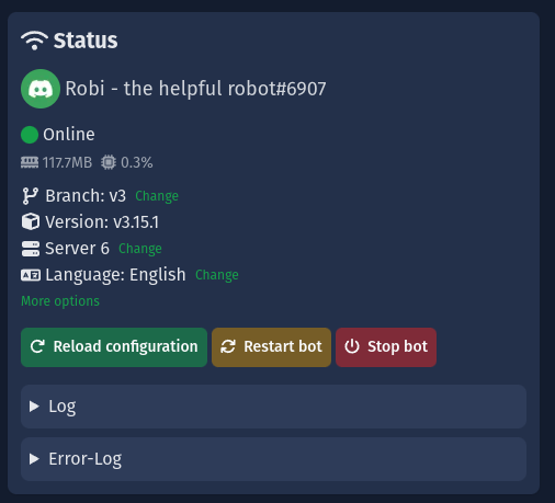 3. Klicke auf "Mehr Optionen" in dem "Status"-Panel von deinem Bot.
