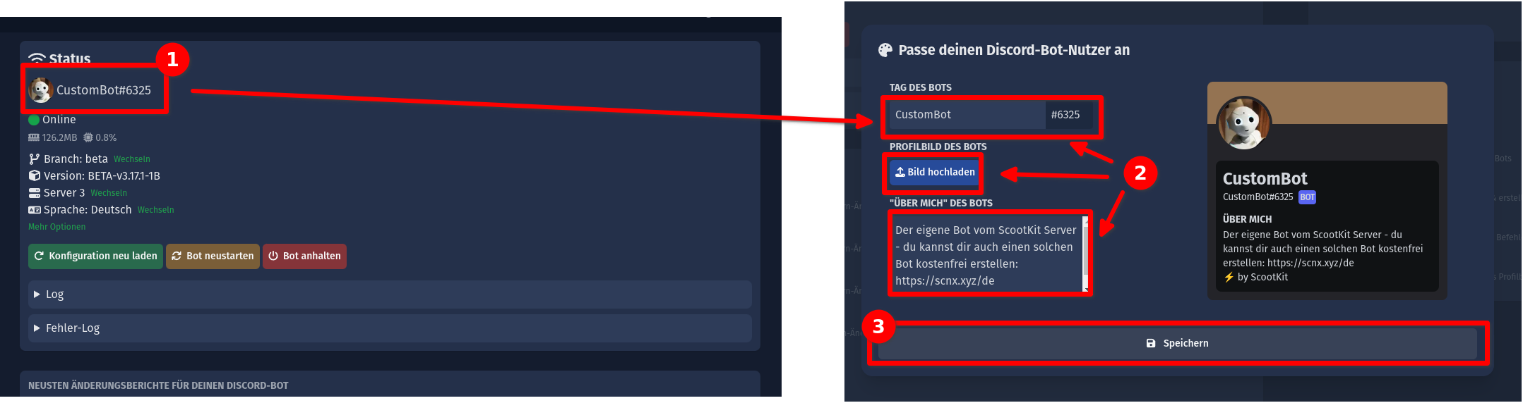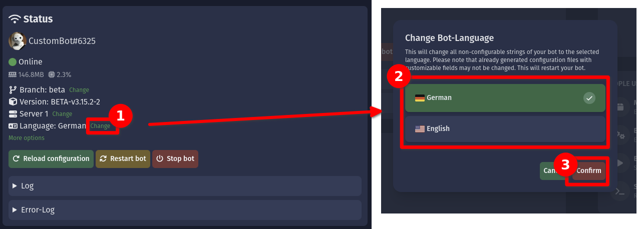 • "Bot neustarten": Dies wird den Prozess deines Bots neustarten. Dies wird eventuell einige Minuten in Anspruch nehmen, zusätzlich wird der Bot für eine kurze Zeit offline sein, in welcher der Bot nicht erreichbar sein wird. Du solltest deinen Bot nur neustarten, wenn du dazu aufgefordert wirst, seltsame Fehler auftreten oder du ein Update durchführen willst.