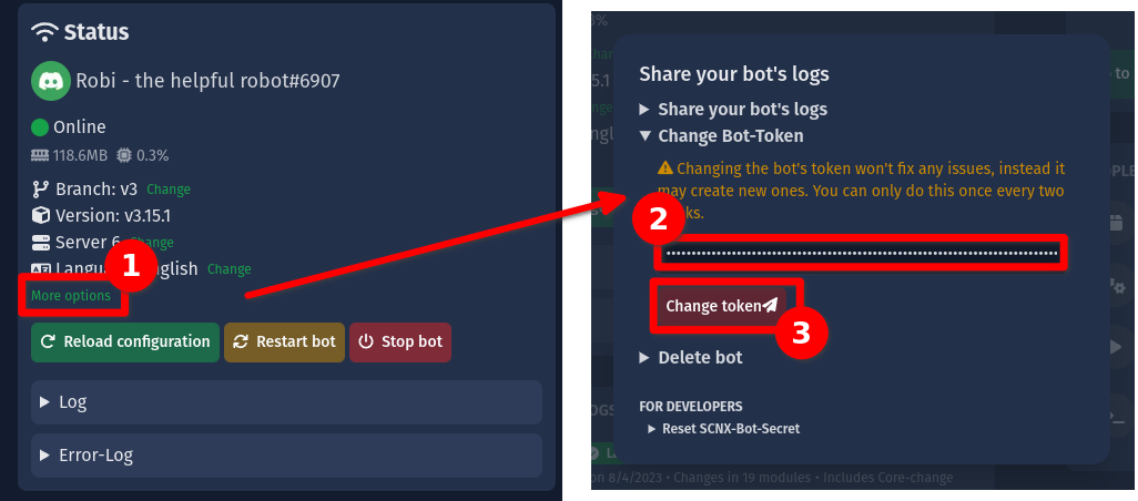 5. Füge deinen neuen Bot-Token ein und bestätige die Änderung, indem du auf "Token ändern" klickst.
