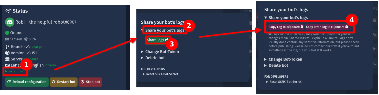 3. Klicke auf "Teile deine Bot-Logs" und danach auf "Logs teilen". Dein Bot-Host wird nun die Logs auf paste.scootkit.net hochladen, dies kann ein paar Sekunden dauern.